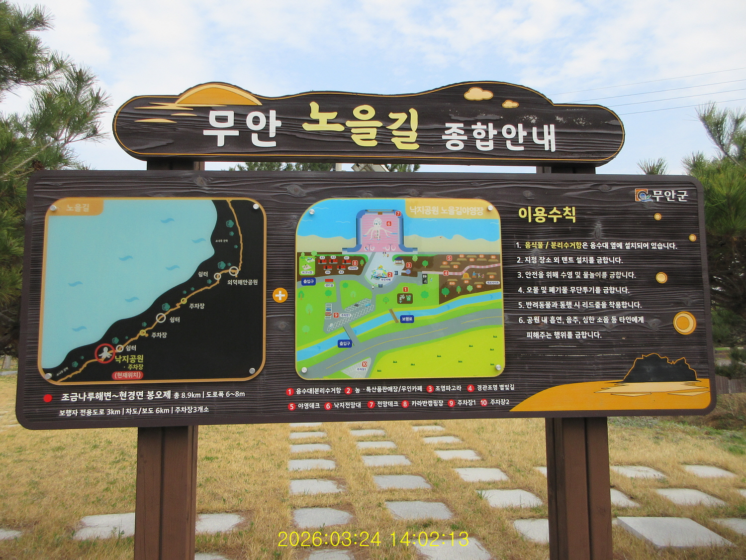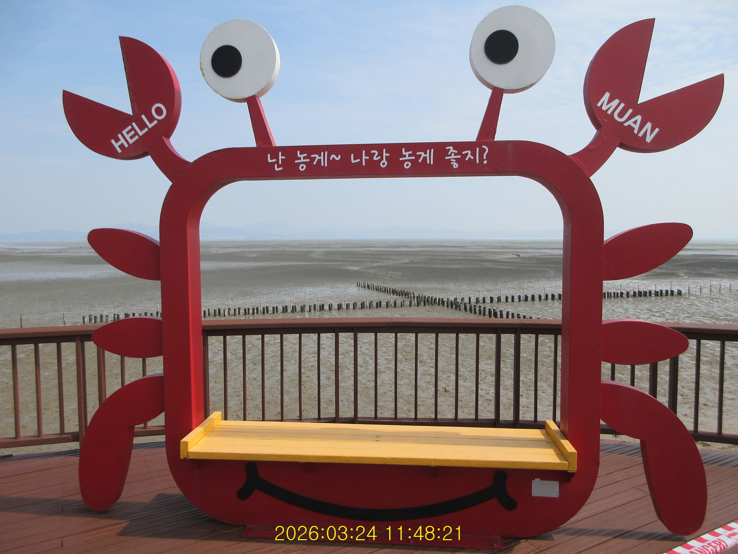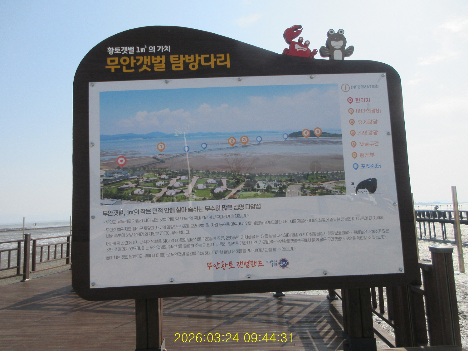 0.답사코스:순천출발07:45-무안황토갯벌랜드 주차장09:44-무안갯벌다리09:44-바다헌장비09:49-가입마을 해안가10:11-무안황토갯벌랜드 회귀11:39-무안 낙지, 농게 조형물11:48-주차장11:57-수암정 점심 (12:07-12:50)-무안낙지공원 주차장13:17-낙지조형물 전망대13:18-해안가 소나무숲 산책 (13:21-13:48)-노을길 야영장(13:50-14:00)-신안 압해도-암태도 천사대교 - 암태도 신석항 15:09.