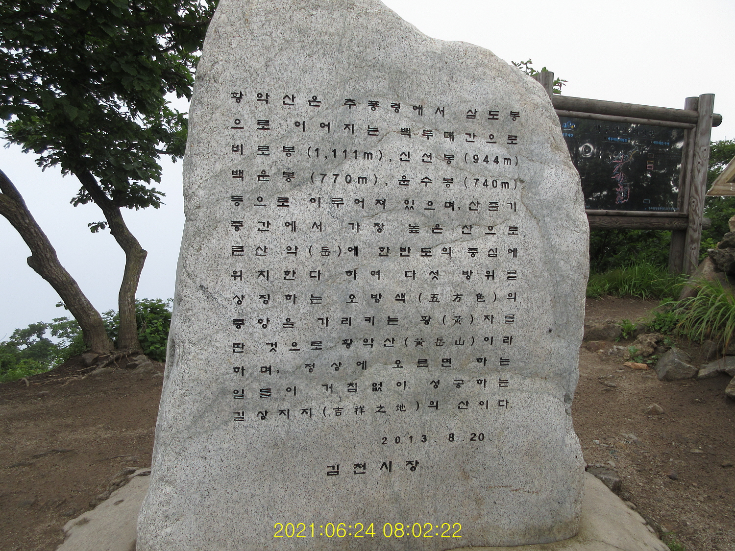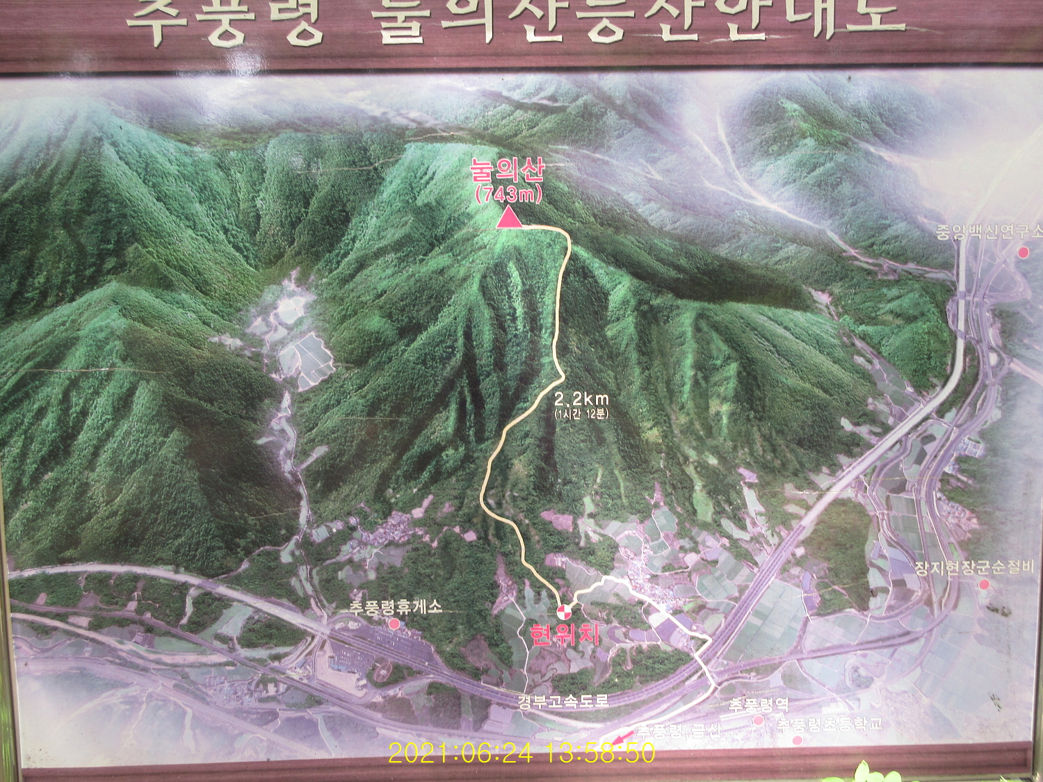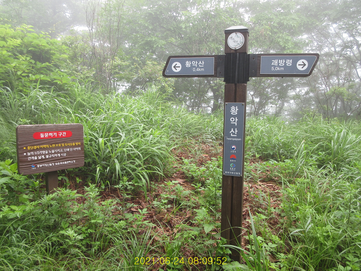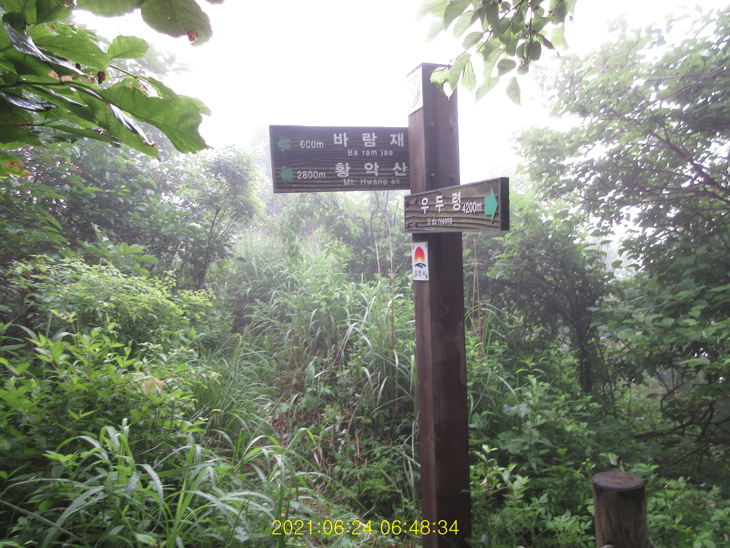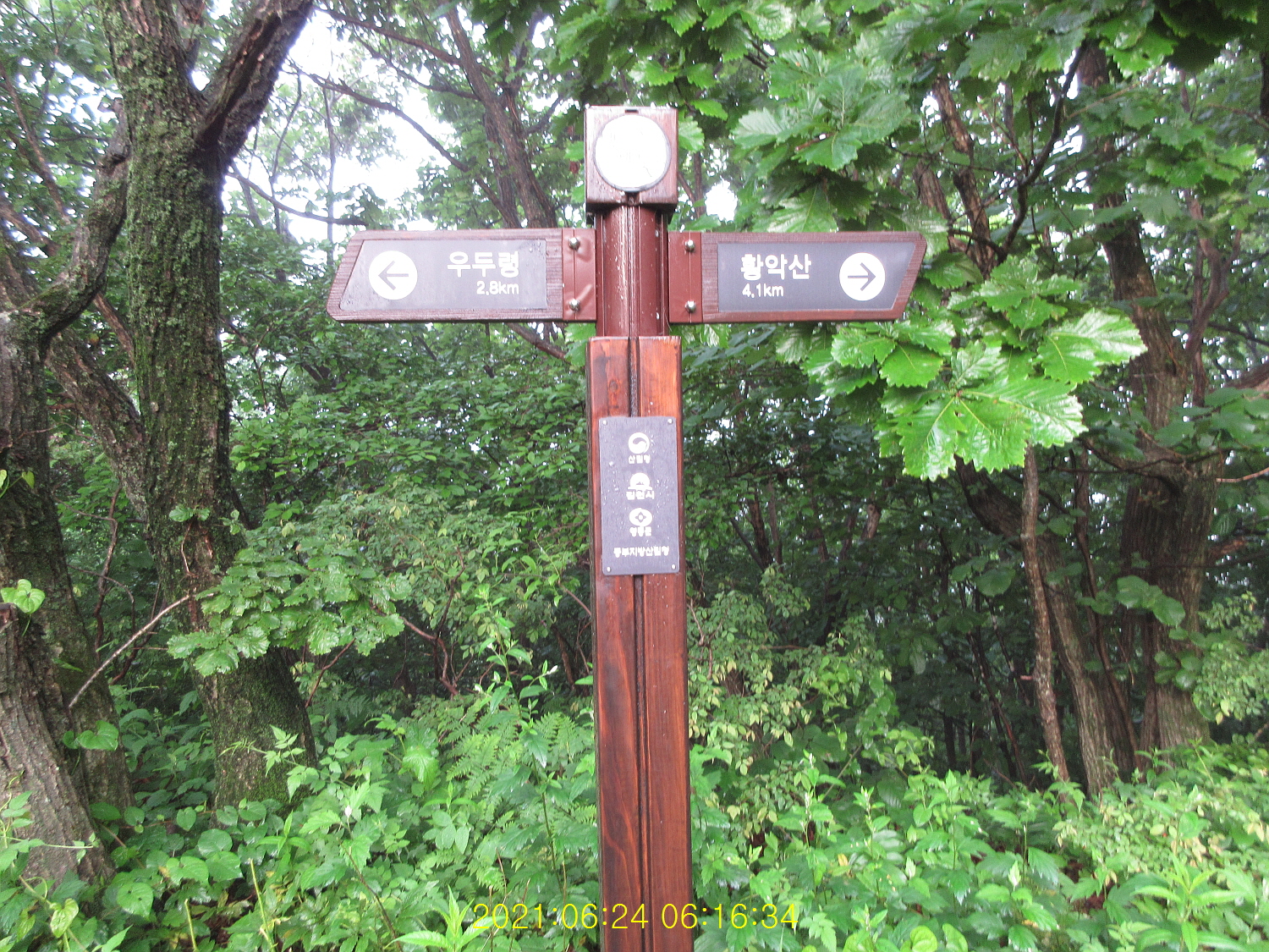 0.산행코스:우두령 05:12-산행시작05:18-삼성산06:06-우두령06:33-여정봉06:38- 바람재정상06:48-바람재07:03-신선봉 갈림길07:26-형제봉07:37-황악산 07:55-선유봉(1045m) 08:12- 백운봉08:35-직지사 갈림길08:45-운수봉08:52-여시굴 09:11 - 여시골산09:24-괘방령09:56-가성산11:35-장군봉12:10-점심(12:20-12:35)- 눌의산 13:05-폐헬기장 13:18-눌의산 등산안내도13:58-고속도로 지하도14:08- 추풍령14:24.