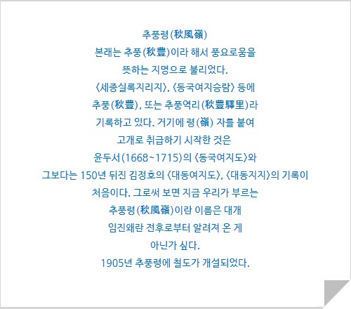 ▲추풍령은 경북 김천시 봉산면과 충북 영동군 추풍령면 경계에있는 고개로 해발 221m로 년중 시원